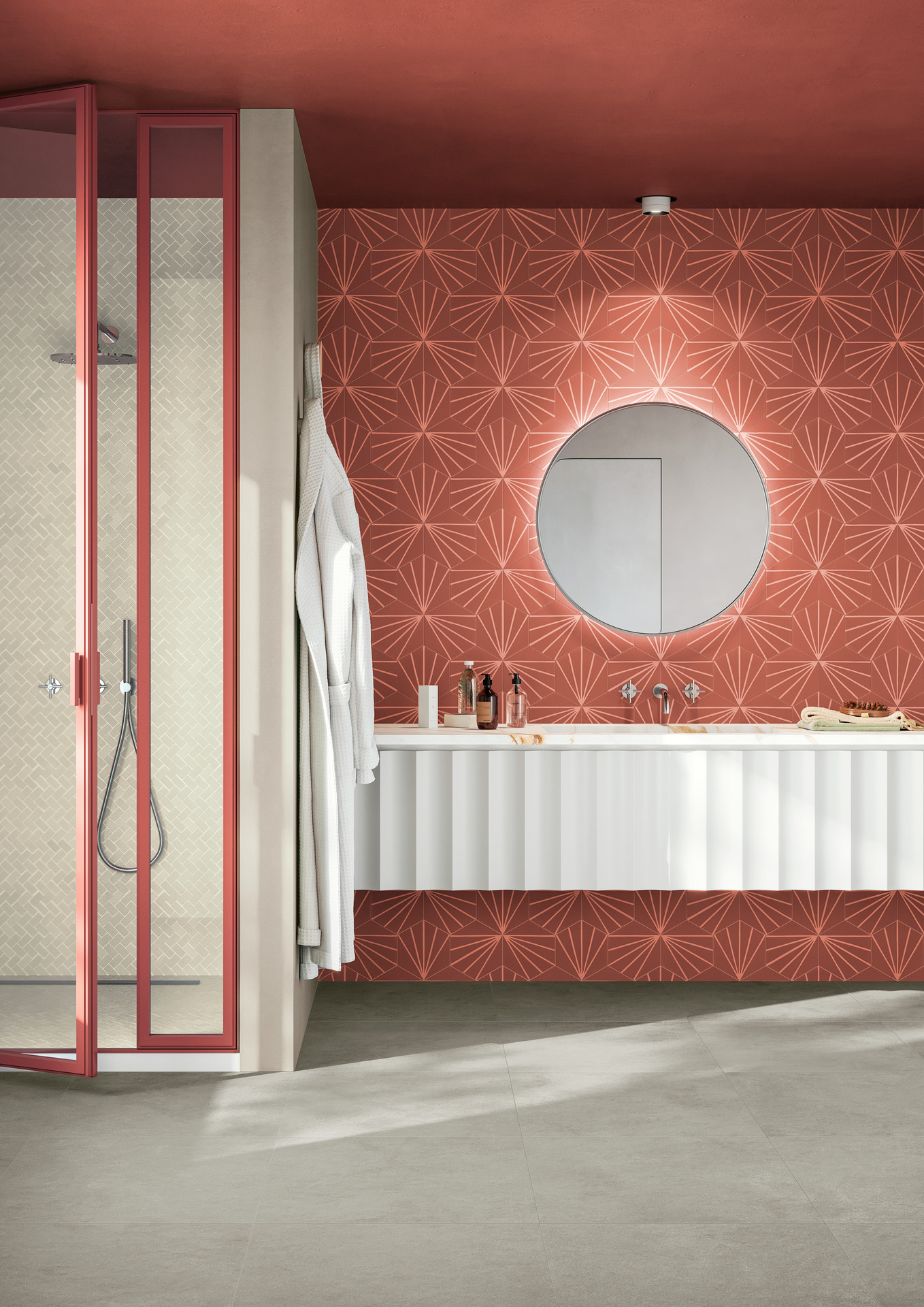Ragno Stratford Stratford is a complete and articulate collection developed on a variety of colors, shapes and decors, joined by the new 120x278 cm thin slab format, available on all eight colors, and the 120x120 cm format in the three trend colors Red, Green and Blue. The large slabs amplify the intense beauty of concrete-effect stoneware surfaces, which can be combined with Stratford Wall decorative wall tiles or other Ragno series to suggest unique textural contrasts in residential and commercial settings.