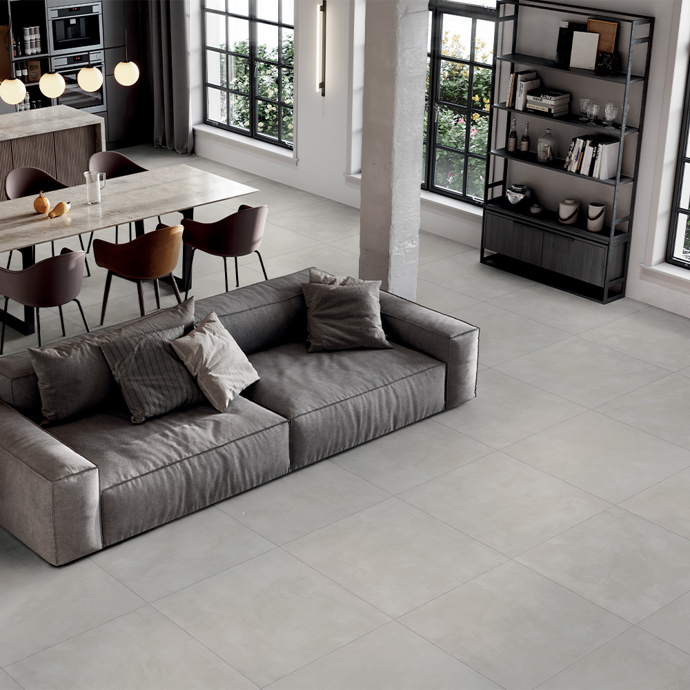 A refined ceramic interpretation of troweled and polished resin for contemporary styled, airy and cozy rooms.